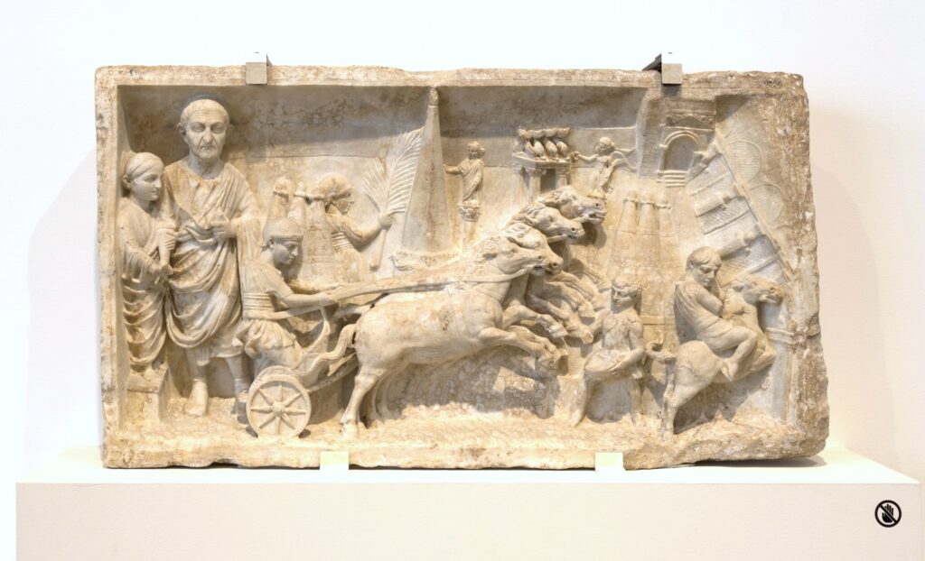 Do not miss the bread and circuses. When Juvenal, a satirist, invented the phrase, it was very much a dig at the common folk for being so easily placated. And the circuses still distract. A parade helmet of a murmillo, a heavily armed gladiator, is decorated with images of music and the arts. A funerary relief of the Circus Maximus shows a charioteer with four horses rampant, perfectly in sync. At the left stands the deceased—“He may have worked for one of the racing teams,” Segrave explains—with his wife, who obviously died before him, as she is standing on a pier.