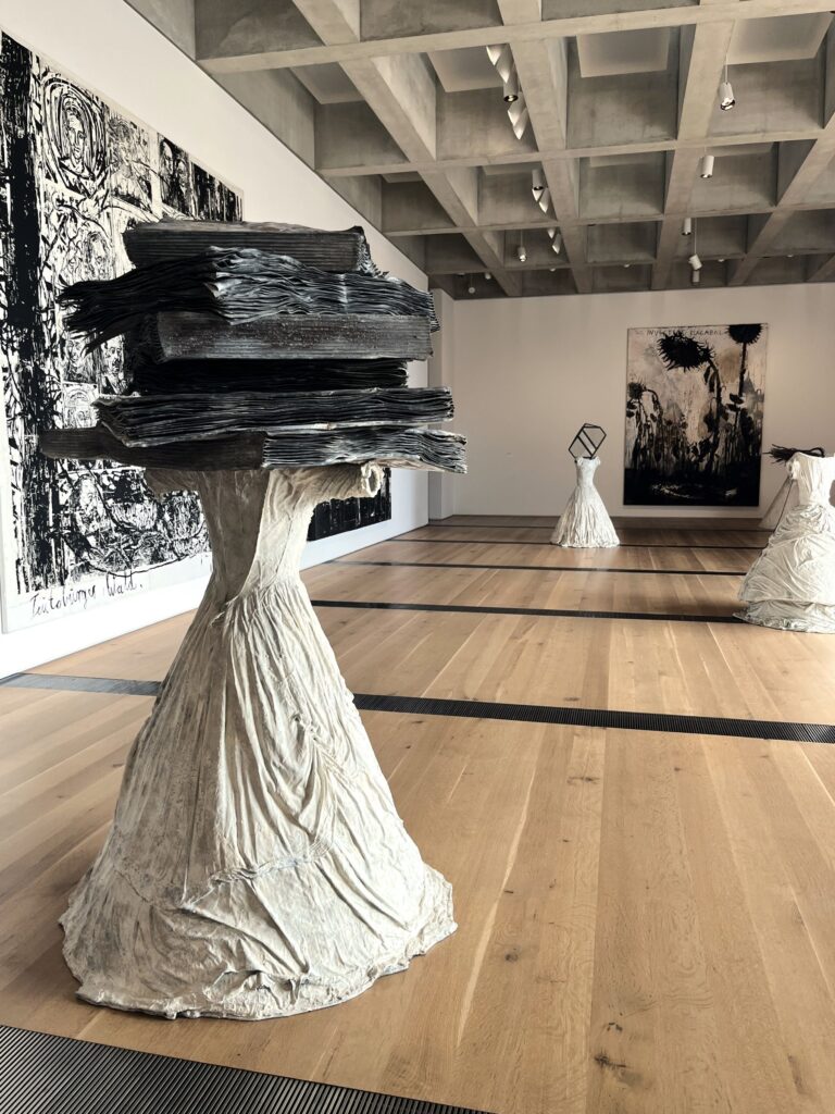 Dusty, for example. Assistant curator Melissa Venator was forbidden to clean the steel exhibit tables he had shipped from his studio in France, let alone remove the grime from his ivory resin and bronze bridal gown sculptures. Several of the new works arrived with the paint still wet. He wanted none of them roped off; if you see a discreet cord protecting one of the artworks, that means it is on loan from another museum. Those he owns, you can come close to—the artist’s books on those steel tables bear a sign inviting you to page through, handle them—and in two of the galleries, he insisted that the curtains be drawn back so sunlight can pour in.