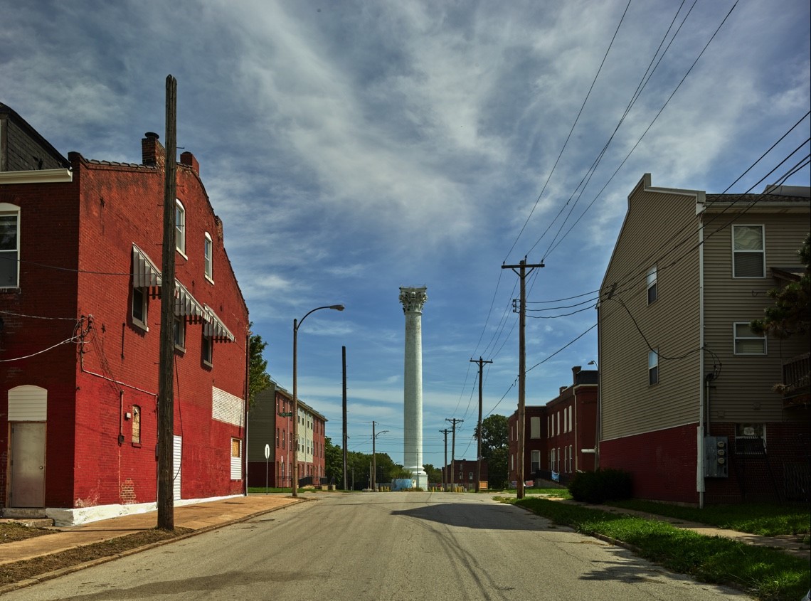 The Grand Avenue Water Tower, shown above, caught the imagination of fine art photographer Michael Eastman. The oldest water tower in St. Louis, it stands proud at Grand and North Twentieth, surrounded by dilapidated but solid redbrick buildings, vacant houses, curbside shrines where children died, and to the west, a convent of contemplative nuns. Rising above all the attempts at urban renewal, all the crime, all the prayer, this is the tallest free-standing Corinthian column in the world. At 154 feet, it is more than twice the height of Pompey’s Pillar in Alexandria, almost three times as tall as the Olympieion in Athens. Built in 1871, the Grand Avenue tower was designed to house a standpipe five feet in diameter and a spiral staircase that rose to the capital. Renovated a quarter-century ago, its white paint needs refreshing, but that is no more than a powder puff to a shiny forehead. Just looking at the tower settles my soul.