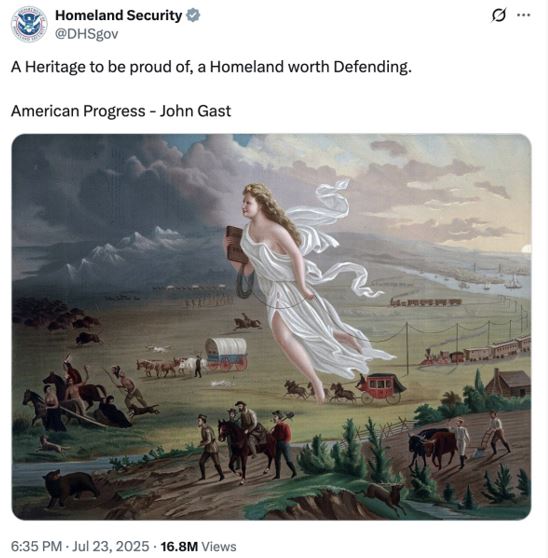 The year Gast painted American Progress, the writer notes, “a contingent of 130 soldiers of the 5th Calvary Regiment arrived at Skeleton Cave in Arizona’s Salt River Canyon, where a group of Yavapai people had been sheltering. In under an hour, the army slaughtered almost a hundred of the Yavapai, including many women and children.”